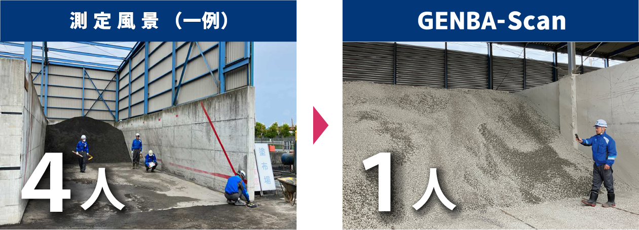 従来の計測方式では、複数人でメジャーを使用するなどしておまかな体積を算出していました。 GENBA-Scanは計測から体積算出まで一人で行うことができます。