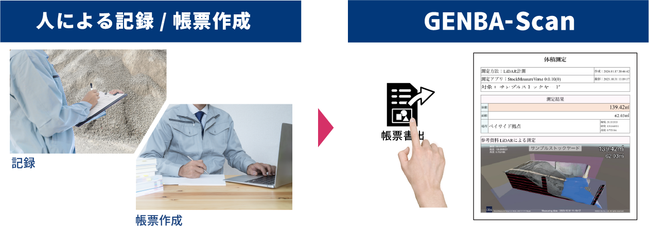 従来の計測方式では、紙で記録し、それを元に帳票作成を行う手順でした。 GENBA-Scanはボタンひとつで帳票を自動出力できます。計算ミス、転記ミスなどの心配がありません。