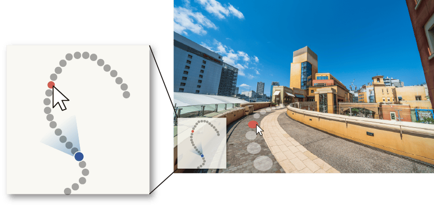 360°ビュー内の経路点やマップ上で経路点を選択することで、その場所にジャンプできます。少しずつ進む必要がなく見たい場所へ最短でアクセスできます。