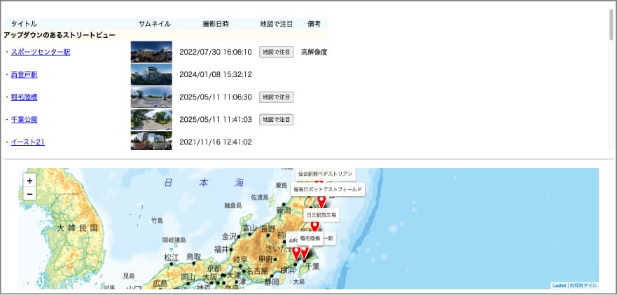 撮影した場所を地図上で一覧表示でき、スムーズに360°ビューの閲覧に繋げられます。これによりデータの検索や管理が容易になります。