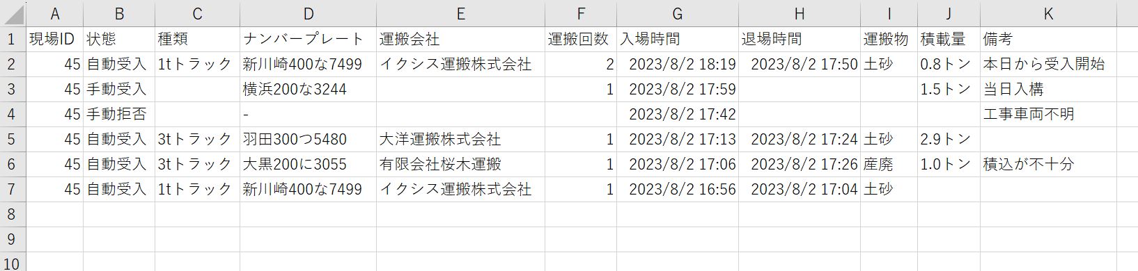車両の入退場の時間、1日における入退場の回数を、車両ごと、会社ごとに集計することができます。CSVでダウンロード可能です。