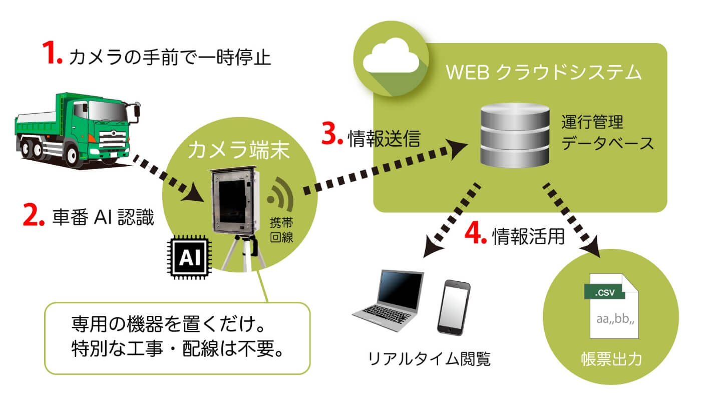 疲れ知らずなAIが、車両の登録を正確に実施しますので、現場の省力化・情報の透明性を実現できます。