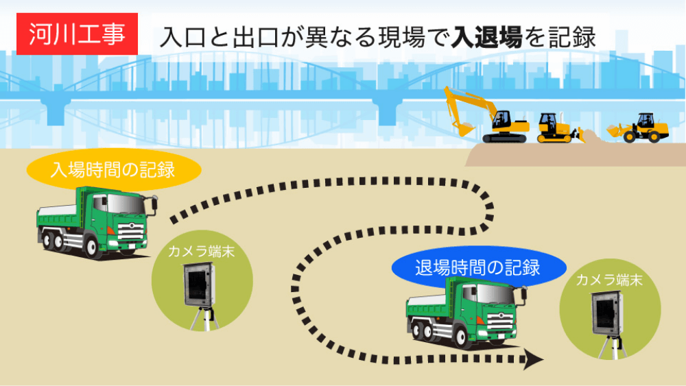 入場ゲートと退場ゲートが離れている現場では、それぞれに機器を置いて入退場を管理できます。河川の工事や、大規模な現場では複数台の運用がお勧めです。