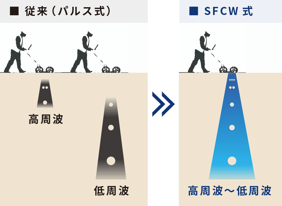 高周波高周波SFCW式は、周波数を段階的に変調させることができるため、1台で深く細かく探査可能です。