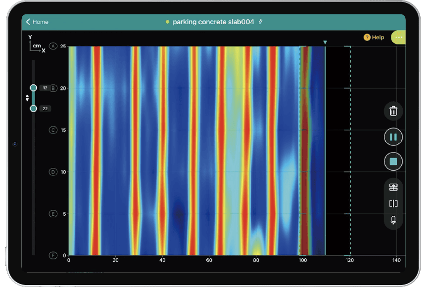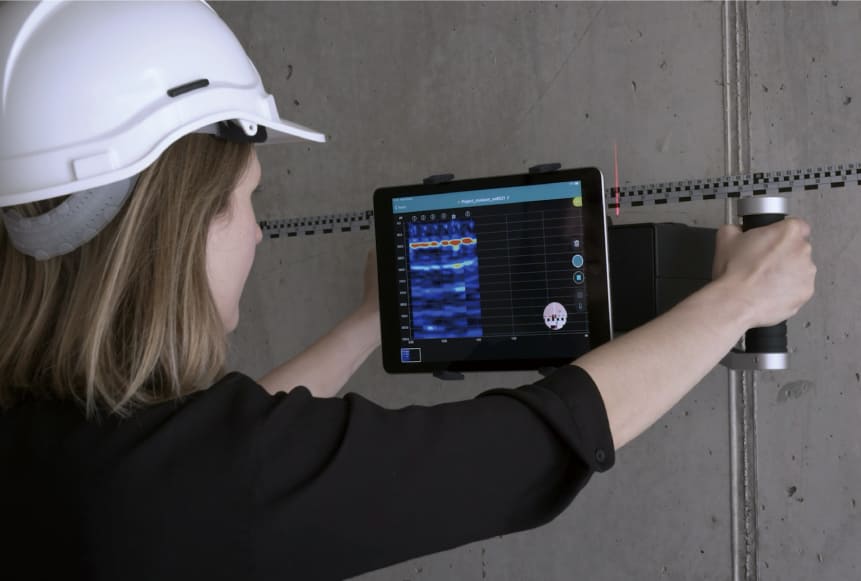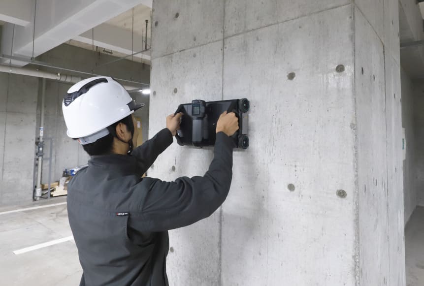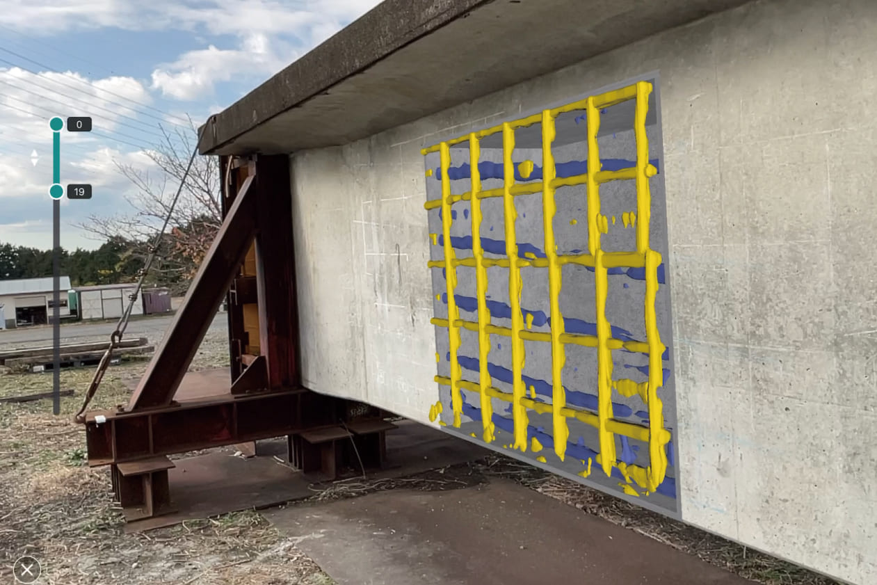 本システムは、電磁波レーダーによるコンクリート内部または地中の埋設物検査装置です。従来の鉄筋・地中探査レーダーでは実現できなかったリアルタイムの3D可視化、AR(拡張現実)による対象物への投影機能を持ち、現場を止めることなく直感的に内部の状況を観察することができます。