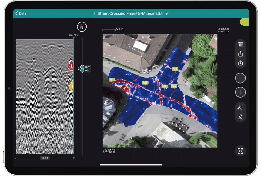 広範囲を効率的かつ高精度に探査し、GNSS連携で地図上にリアルタイムマッピング
