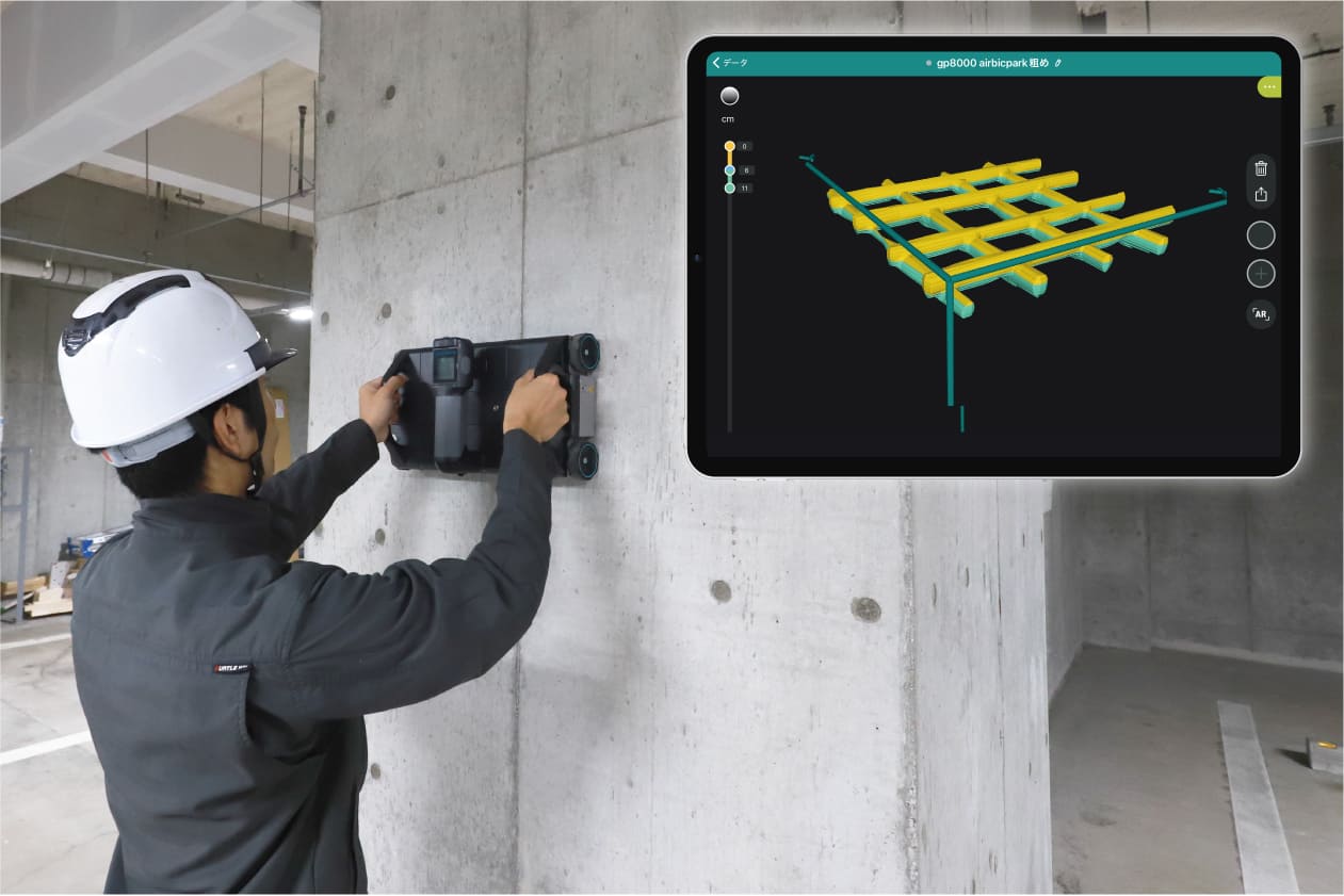 現場で測定したデータは、専用のタブレットですぐに確認することができます。用途に応じて2D表示、3D表示、AR表示などを選択可能です。